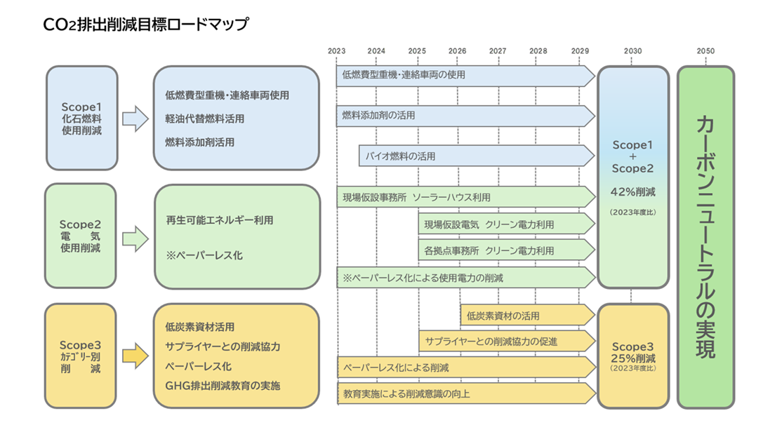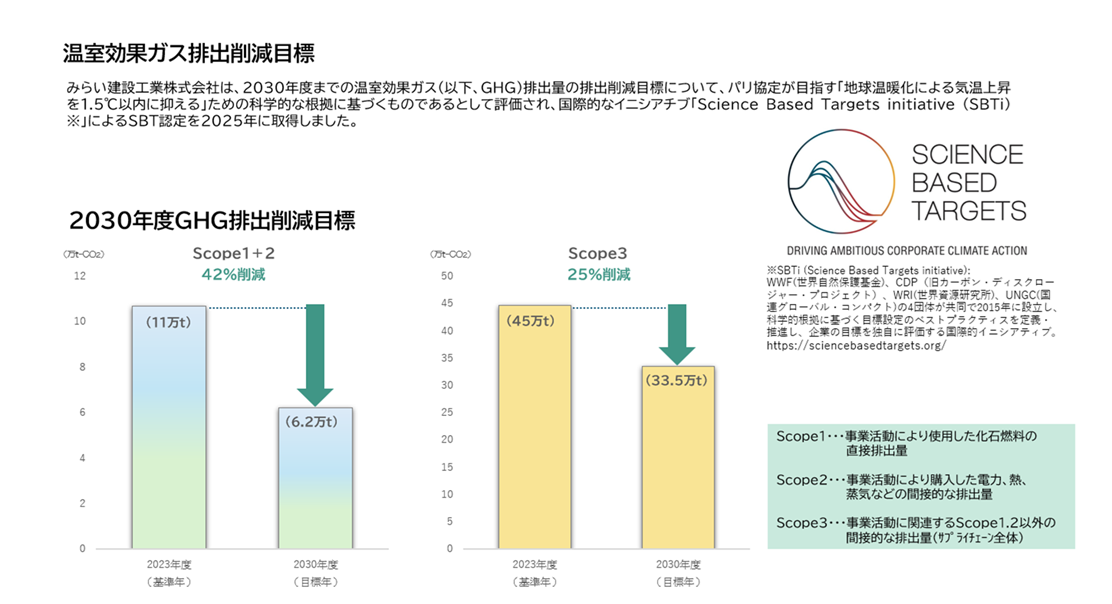 みらい建設工業は、SBT(科学的根拠に基づく目標)達成に向けた取り組みとして、温室効果ガス削減目標のロードマップを策定しました。このロードマップは、2030年までにScope1・2の排出量を42%、Scope3の排出量を25%削減することを目標としています。 当社はこれらの目標達成に向け、CO2削減に関するさまざまな取り組みを継続して推進してまいります。