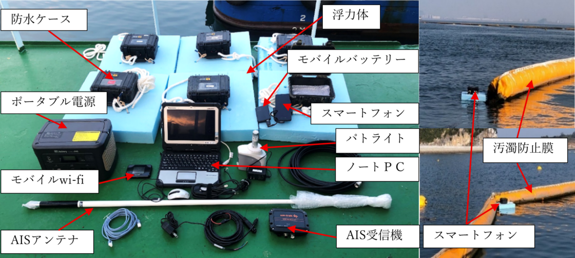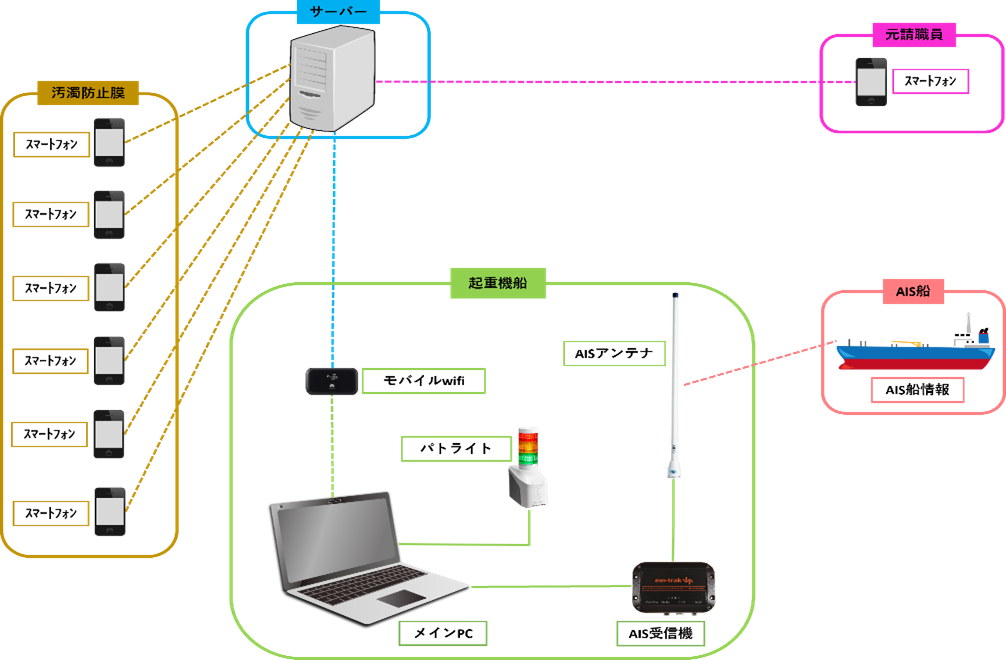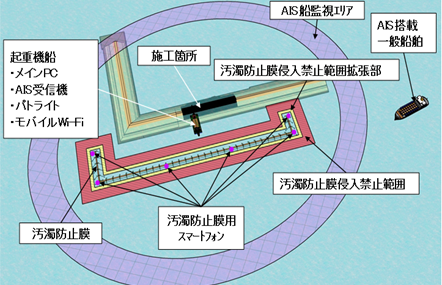 本技術は、スマートフォンで浮体設備や作業船の位置を把握し、AIS情報で一般船の位置情報を把握して、浮体や船舶の位置を一元管理するシステムです。