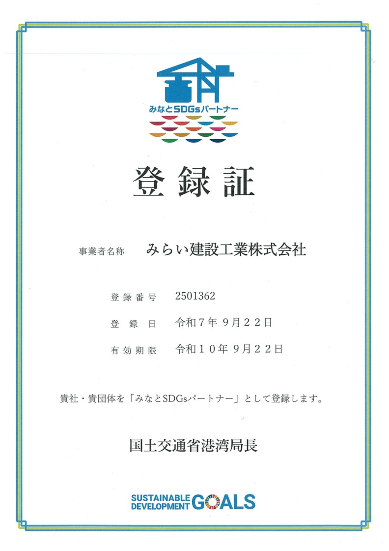 当社は、国土交通省港湾局が創設した「みなとSDGsパートナー登録制度」に登録されております。