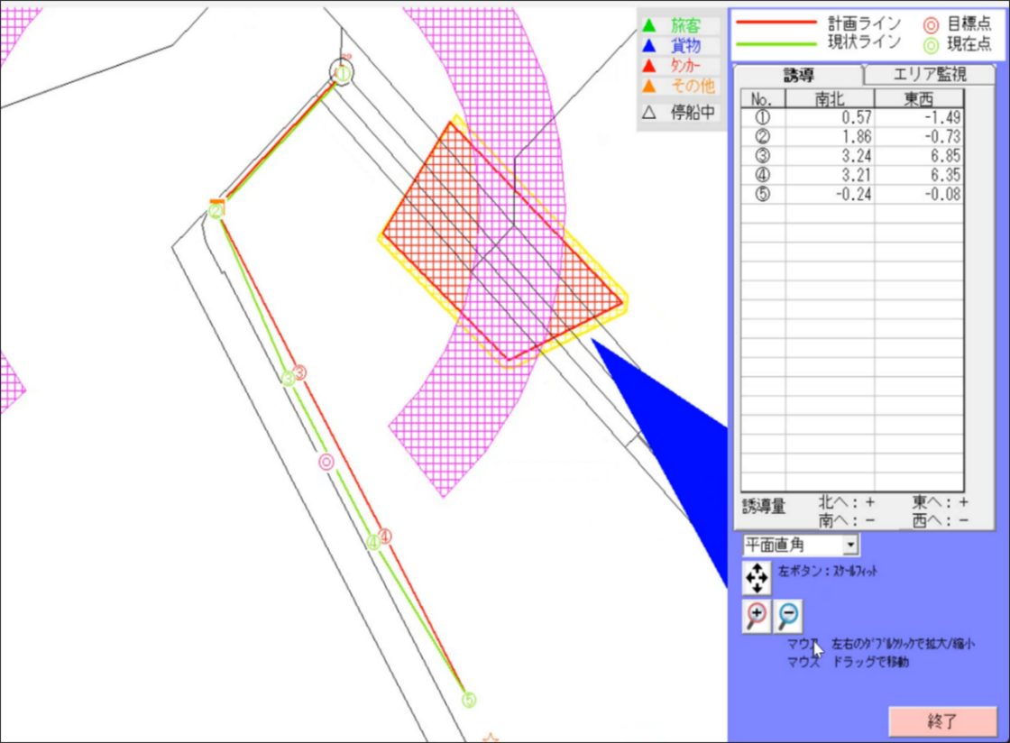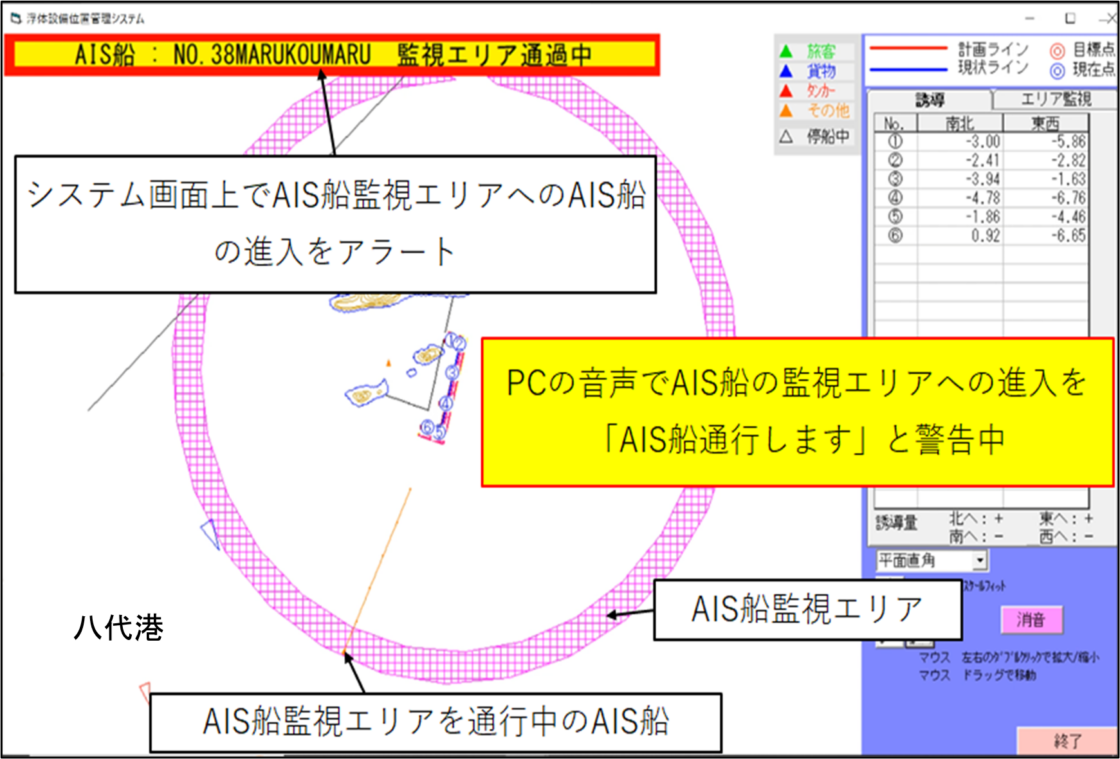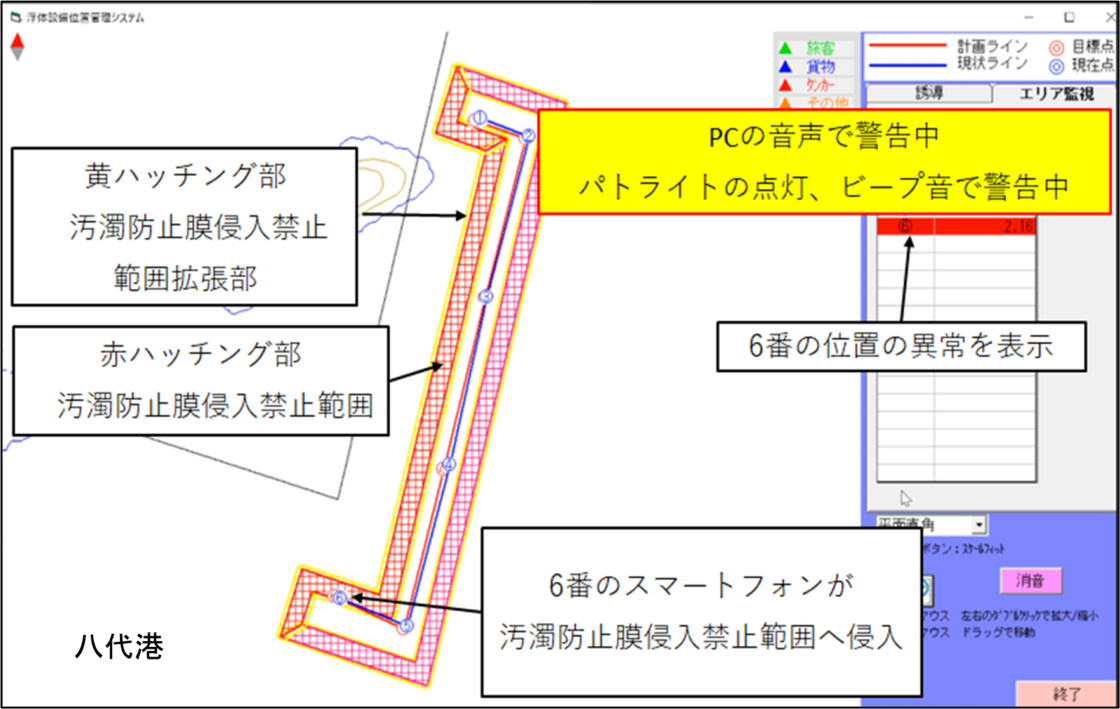 浮体設備および作業船に設置したスマートフォンの位置情報をもとに、浮体設備および作業船の現在位置と航路等の侵入禁止範囲をディスプレイ上に平面的に示し、侵入禁止範囲に浮体設備や作業船が侵入した際、ディスプレイ上のアラート表示およびパトライトの発光・ビープ音、メールで警告します。
