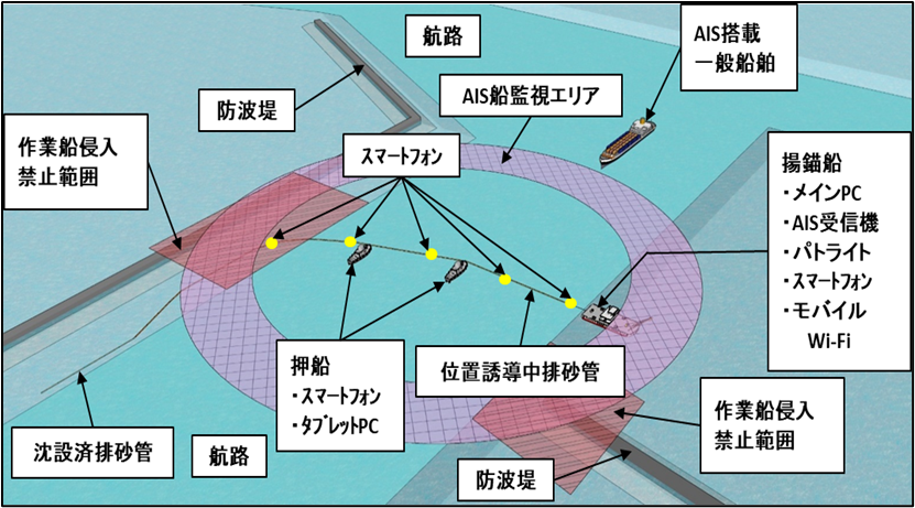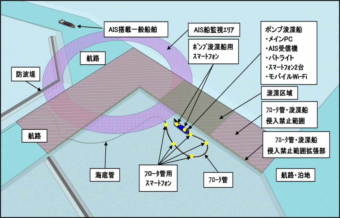 ポンプ浚渫工事における航路外への浚渫船および排砂管(海上管)退避時のシステム全体概要図